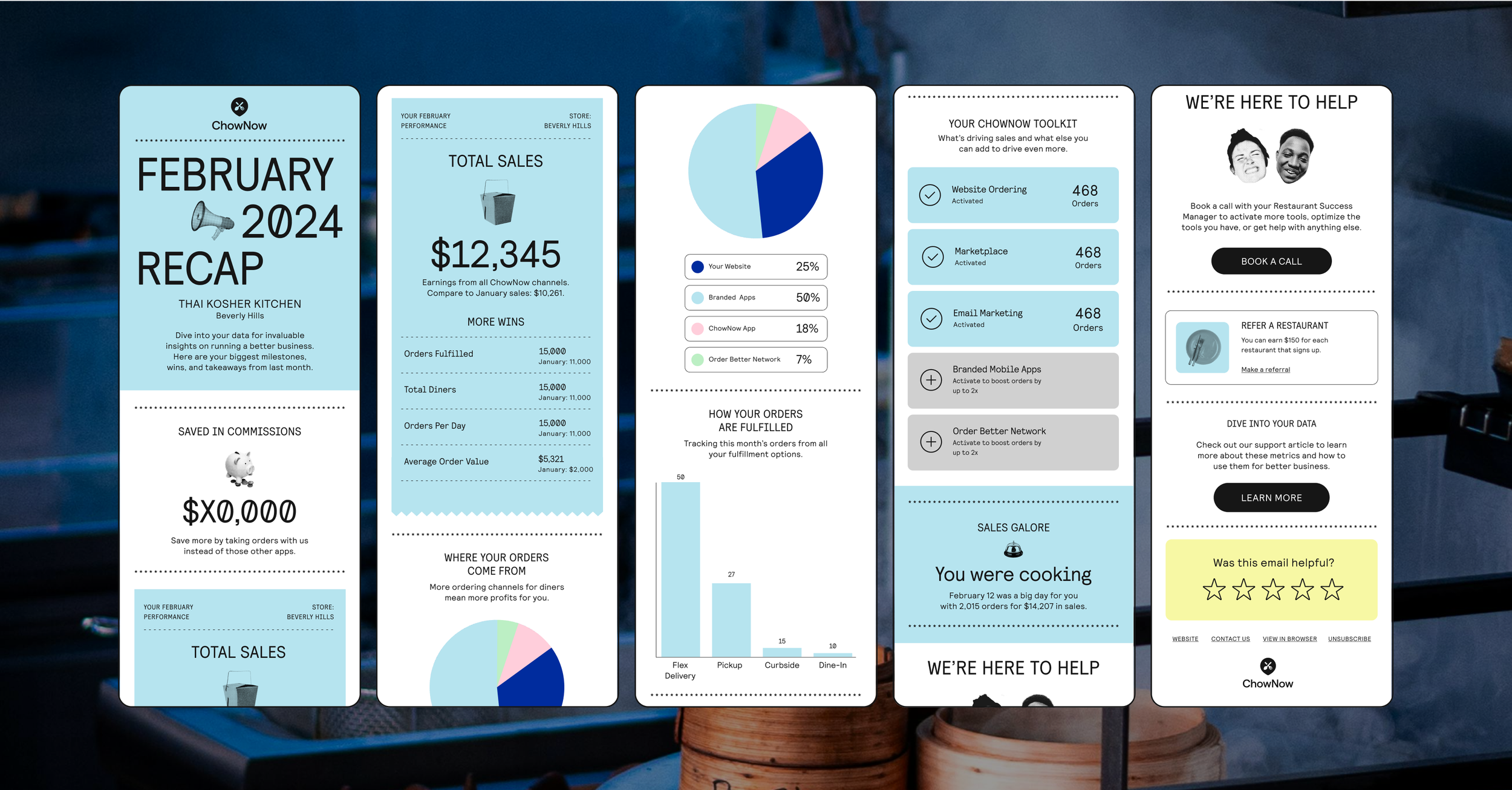 The email was the most challenging design I have ever done since it required many modules. It is a personalized email for restaurant owners who want to see their ROI with ChowNow. It shows fulfilled orders, how much they saved in commissions, and what toolkits they can purchase to help their business.