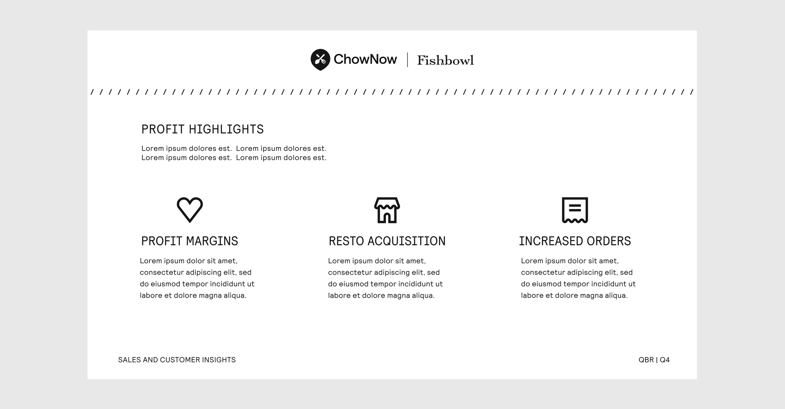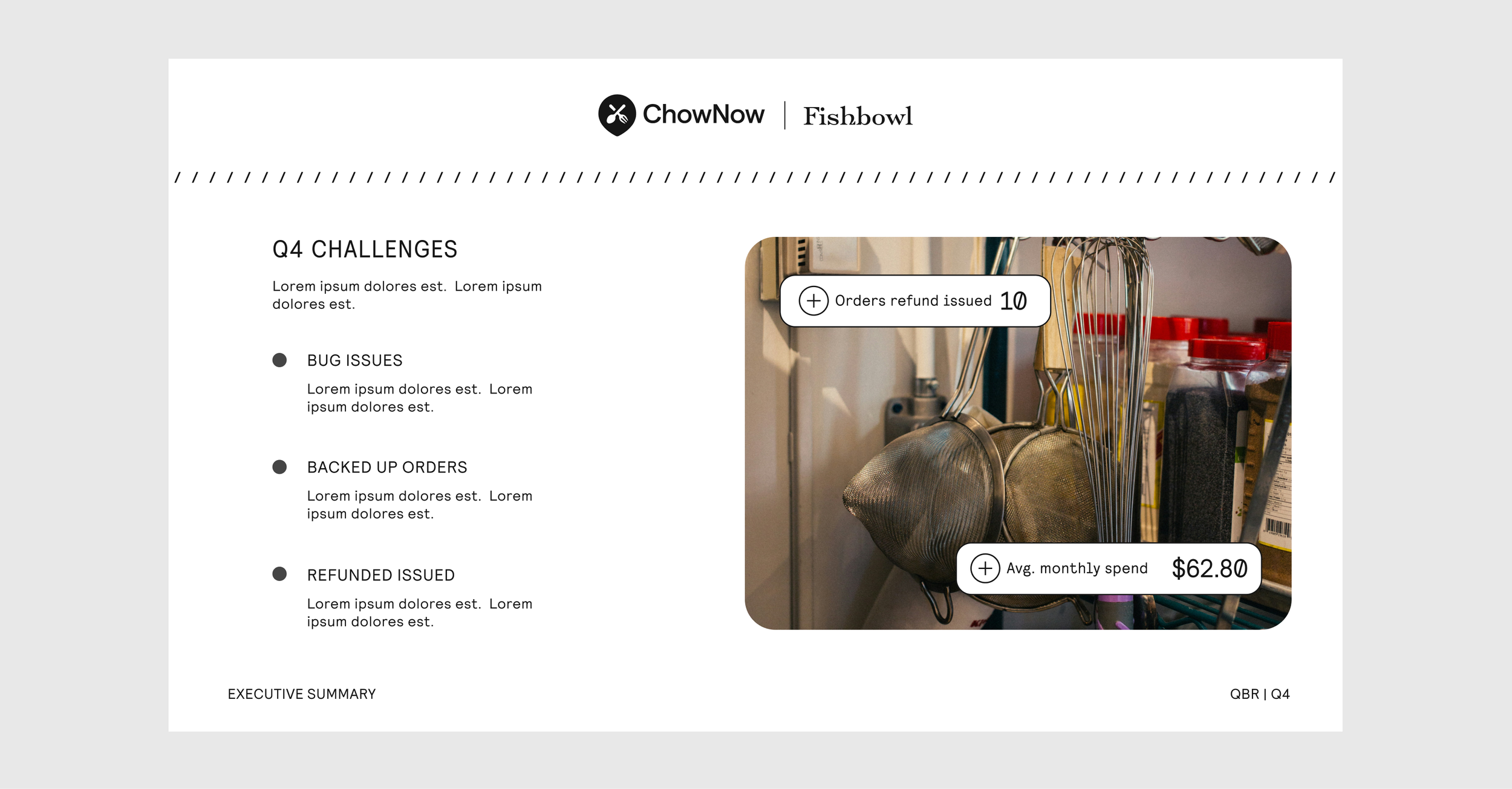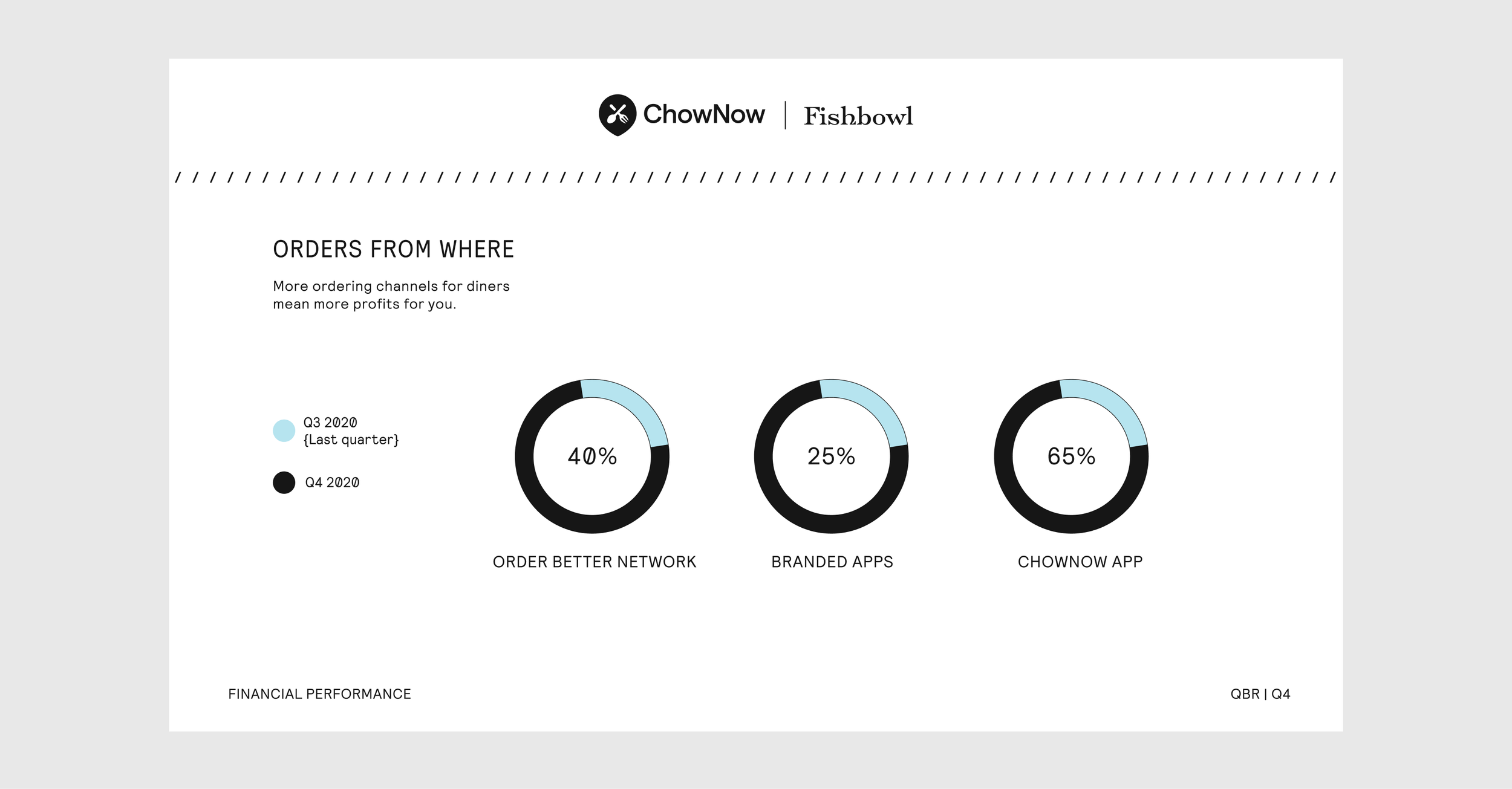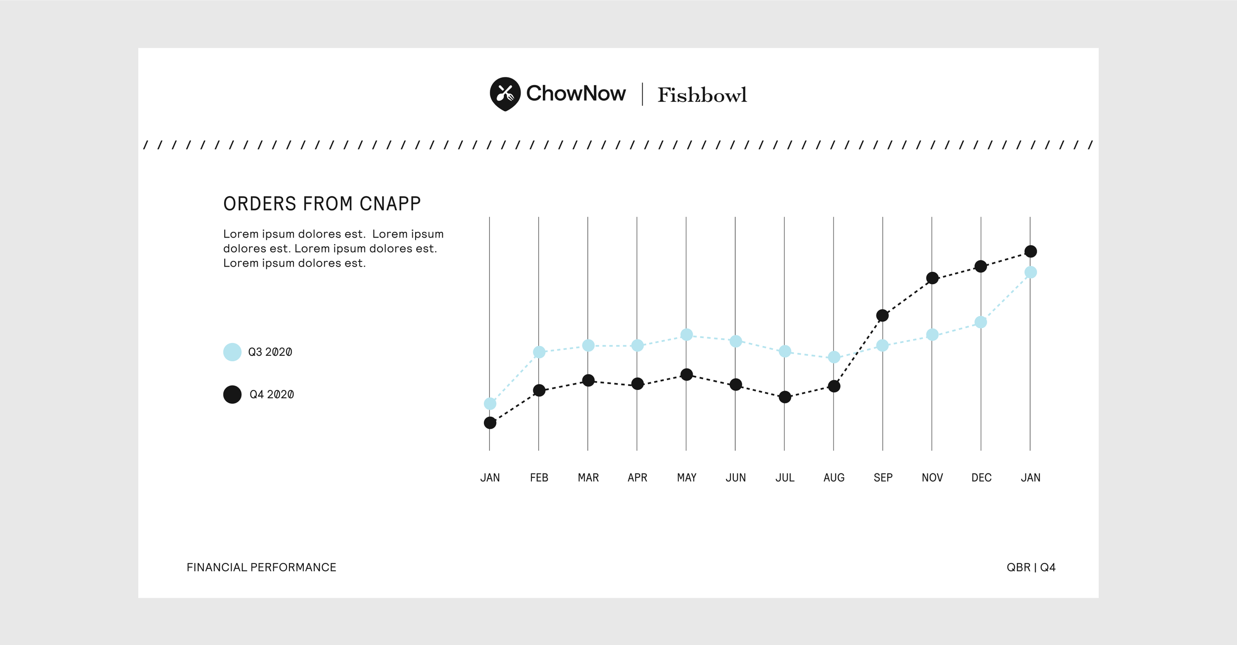 I designed on-brand quarterly business review decks for restaurant partners. Restaurant Success Managers use this opportunity to sell other ChowNow products. I also created board decks for executives. My goals for all the decks are to ensure a polished look and give an engaging experience for the audience.